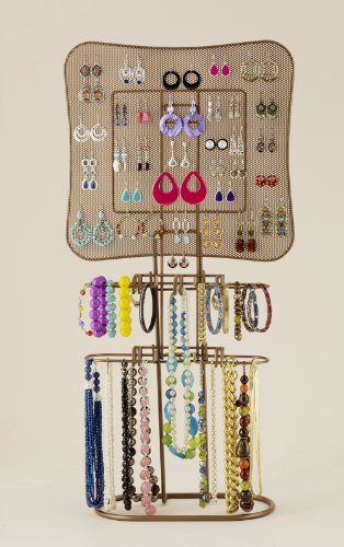 Organizing Jewelry Valet by Longstem. Wall mount or on included table stand in Bronze - Longstem is the mark of Quality! Product DescriptionThe earring rack holds over 50 pairs of earrings. There are five hooks for rings or favorite pieces. There are two 21" rods. One bracelet rod holds over 30 bracelets and one necklace rod holds over 30 necklaces.This organizer is constructed of a sturdy powder coated steel. Includes organizer, stand, bracket and screws. - Jewely Organizer tower can be used on the Stand or can hang on a wall